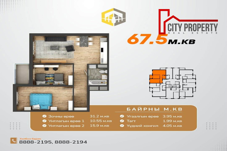 - Талбай: 67.5м²